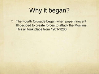 The Fourth Crusade was launched by Pope Innocent III in 1201 to attack Muslims but ultimately sacked the Christian cities of Zara and Constantinople instead. The crusaders' attacks on these cities allowed Venice to gain economic and political power in the region for 60 years until the Byzantine Empire was restored. The crusade ended in 1204 after Constantinople was captured.