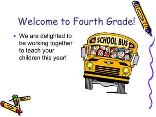 This document provides information for parents about Ms. Kay and Ms. Ivey's 4th grade class. It outlines the teachers' goals of providing engaging learning experiences and helping students develop independence and leadership skills. It details procedures for arrival, dismissal, attendance, and health. It also discusses academics like homework, reading, and math expectations. The document informs parents about celebrating students, communicating with teachers, and asking questions.