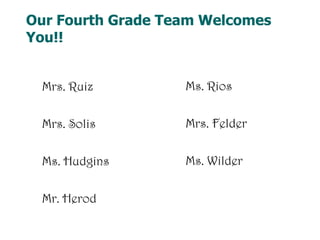 This document provides information for parents about their child's fourth grade orientation. It introduces the teachers and outlines the curriculum, which includes math, science, reading, writing, social studies taught across two teachers. It describes programs for reading, writing, science and social studies. Guidelines are provided around discipline, food, birthdays and communication. Safety procedures are outlined for visitor identification. The document aims to prepare parents for their child's fourth grade experience.