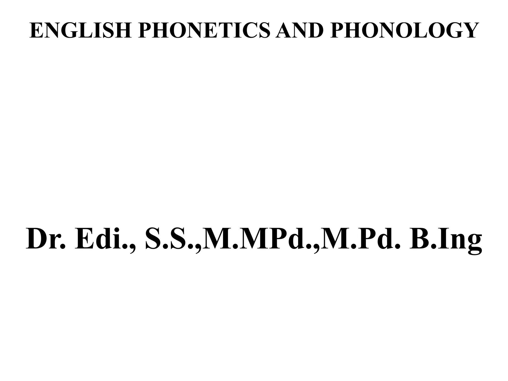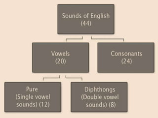 This document provides information about English phonetics and phonology. It outlines that there are 26 letters in the English alphabet but 44 sounds, with 24 consonant sounds and 20 vowel sounds. It then lists and defines each of the 44 sounds using phonetic symbols, including sounds for each consonant and vowel.