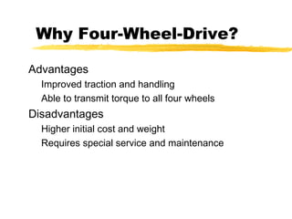 This document discusses four-wheel drive (4WD) vehicles. It describes the main advantages as improved traction and handling from being able to transmit torque to all four wheels. The disadvantages include higher initial costs and weight as well as requiring special service and maintenance. The document defines different 4WD systems such as part-time 4WD which operates in two-wheel drive normally but can engage 4WD, full-time 4WD which constantly powers all four wheels, and on-demand 4WD which automatically engages the front wheels when slip is detected. It provides details on 4WD components, transfer cases, differentials, and maintenance tips.