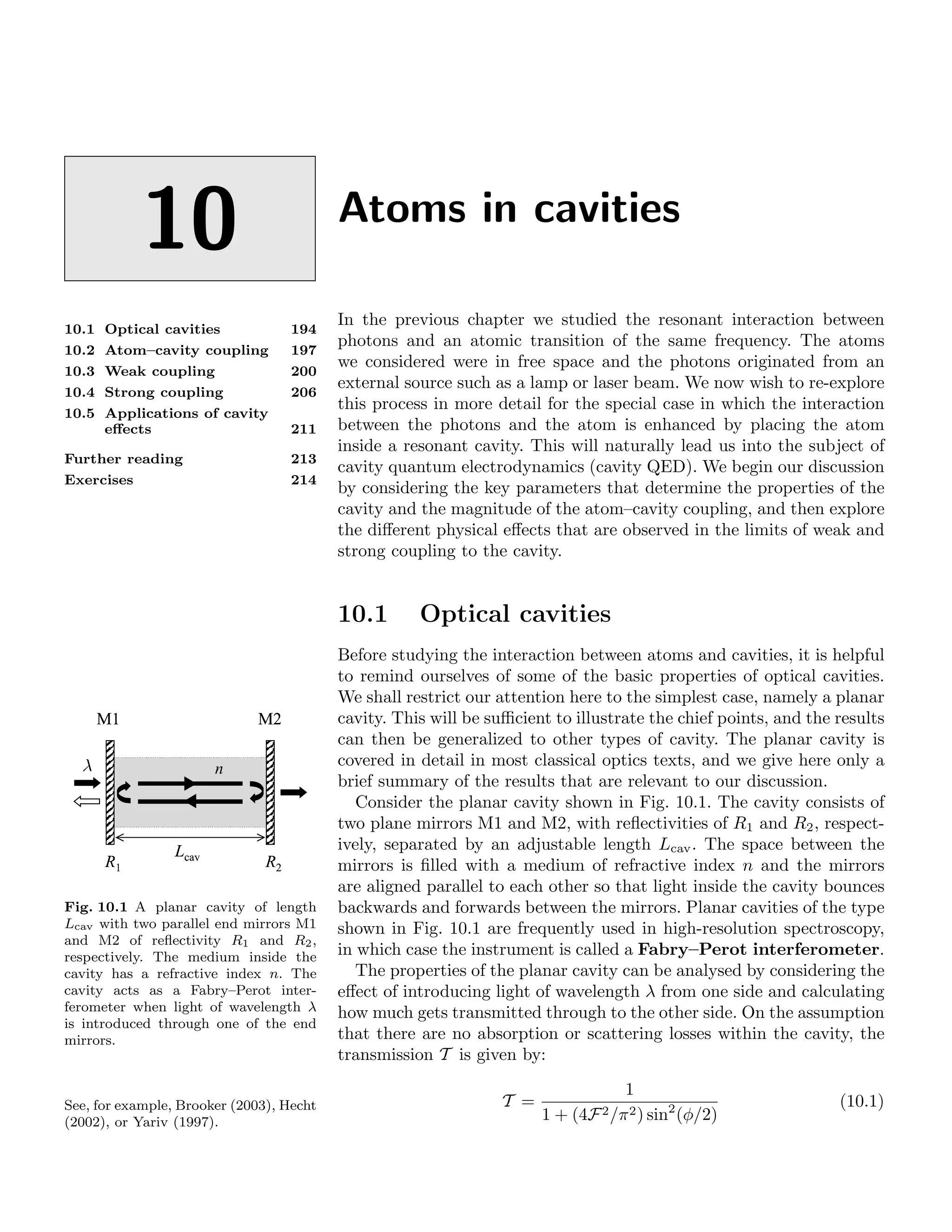 The document discusses atoms placed inside optical cavities. It begins by summarizing the key properties of optical cavities, including resonant modes, finesse, quality factor, and photon lifetime. It then introduces the interaction between atoms and cavities, which is determined by three parameters: the atom-cavity coupling strength, the photon decay rate from the cavity, and the non-resonant decay rate of the atom. The interaction is strongly affected when the atomic transition frequency matches a resonant cavity mode frequency.