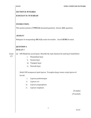 Dokumen ini adalah kertas peperiksaan untuk kursus rangkaian komputer yang mengandungi dua bahagian: Bahagian A dengan 40 soalan objektif dan Bahagian B dengan 2 soalan berstruktur. Soalan-soalan merangkumi topik seperti model OSI, alamat IP, klasifikasi rangkaian, fungsi DNS, dan serangan terhadap rangkaian tanpa wayar. Pelajar diminta menjawab kesemua soalan dengan memberi maklumat terperinci dan contoh yang relevan.