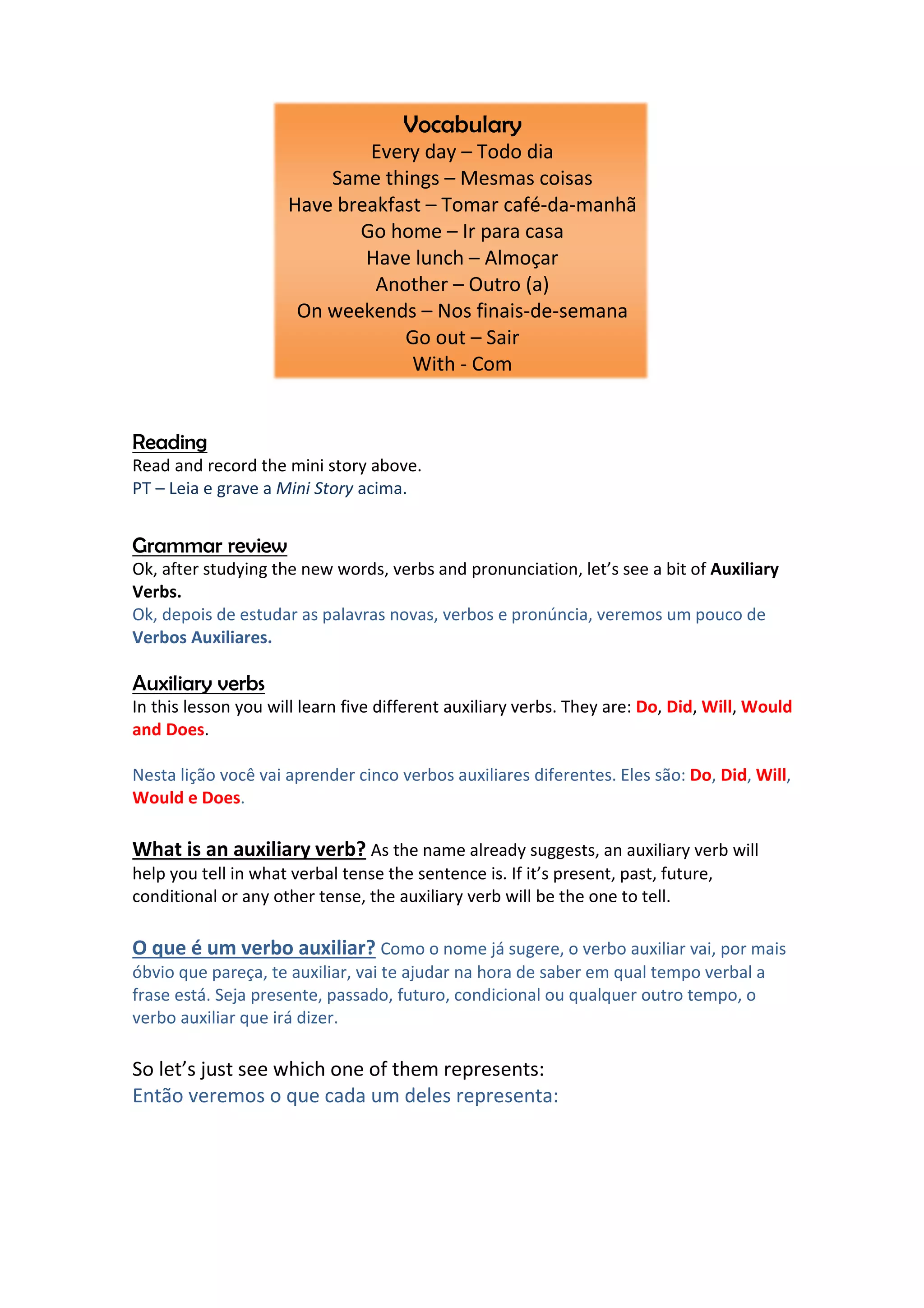 The document is an English lesson about routines. It contains a mini story describing a character's daily routine of waking up, eating meals, going to school/home, studying, watching TV and going to bed. It also contains vocabulary words and grammar explanations about auxiliary verbs like do, did, will and would. Exercises are provided to practice using these auxiliary verbs in questions and answers about daily activities.