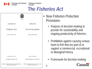 Fisheries and Oceans Canada (DFO) presented on its Fisheries Protection Program and how biodiversity offsets fit into the program. The Fisheries Act prohibits causing serious harm to fish and requires decision-making to support fishery sustainability. DFO's offsetting policy aims to maintain fishery productivity by avoiding, mitigating, and offsetting harm. Offsetting must be considered where serious harm cannot be avoided and becomes an enforceable authorization condition. DFO provides guidance on developing offset plans to select appropriate measures guided by principles like balancing project impacts and supporting long-term fishery benefits. Habitat restoration and creation are examples of offsetting options.