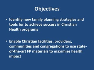 The document outlines strategies and tools for effective family planning within Christian health programs, emphasizing the importance of family planning in achieving various Millennium Development Goals, particularly in relation to maternal health. It provides information on different contraceptive methods, addressing common misconceptions and promoting the use of effective family planning for healthy timing and spacing of pregnancies. The document advocates for overcoming barriers to contraceptive use and ensuring universal access to family planning services.