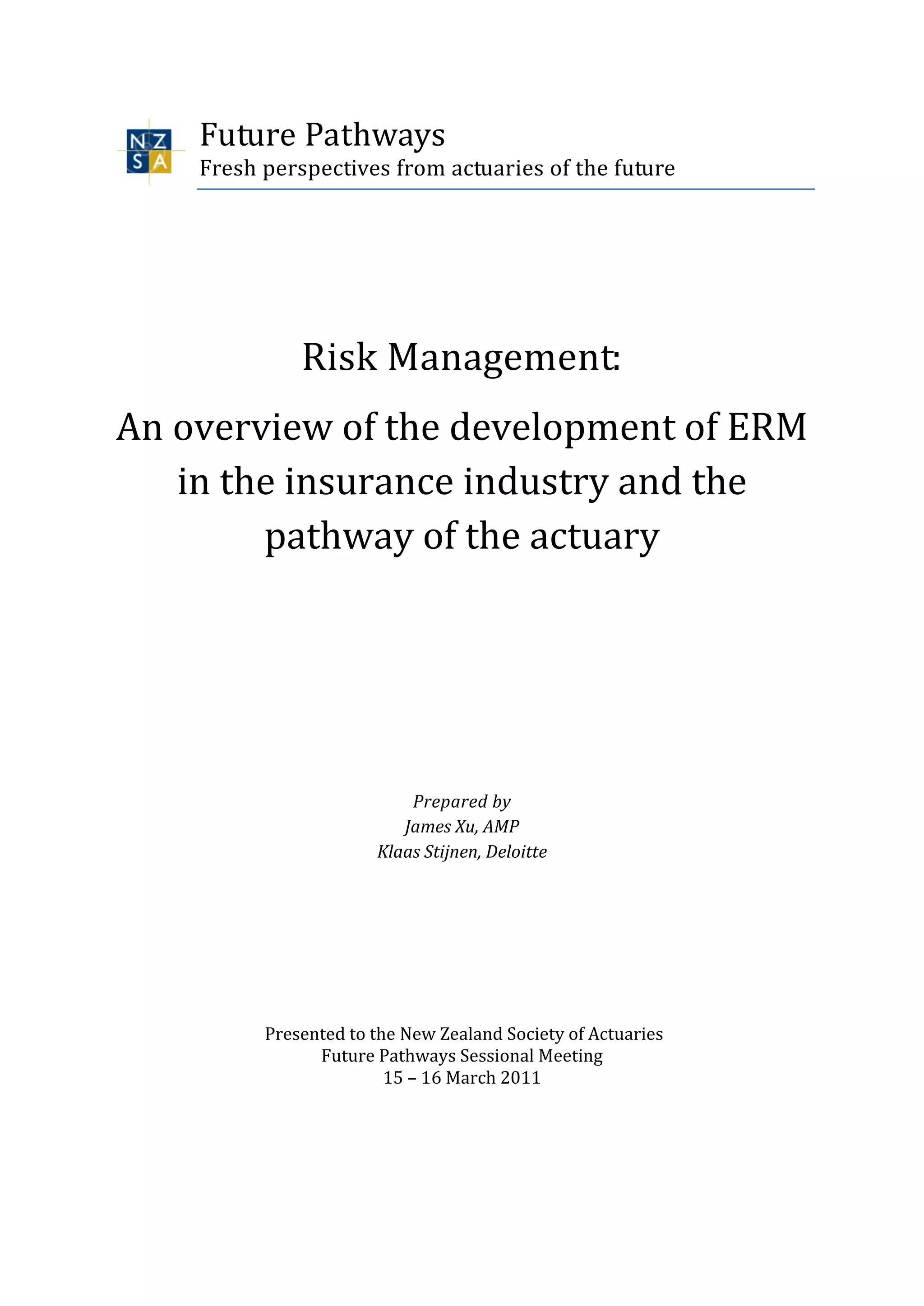 This document discusses the development of enterprise risk management (ERM) in the insurance industry. It provides context on how the Global Financial Crisis highlighted weaknesses in risk management and increased regulatory focus on ERM. It outlines how ERM frameworks assess different types of risk, establish risk appetites and tolerances, and integrate risk considerations into strategic decision making. The role of actuaries in leading ERM implementation for insurers is also discussed.