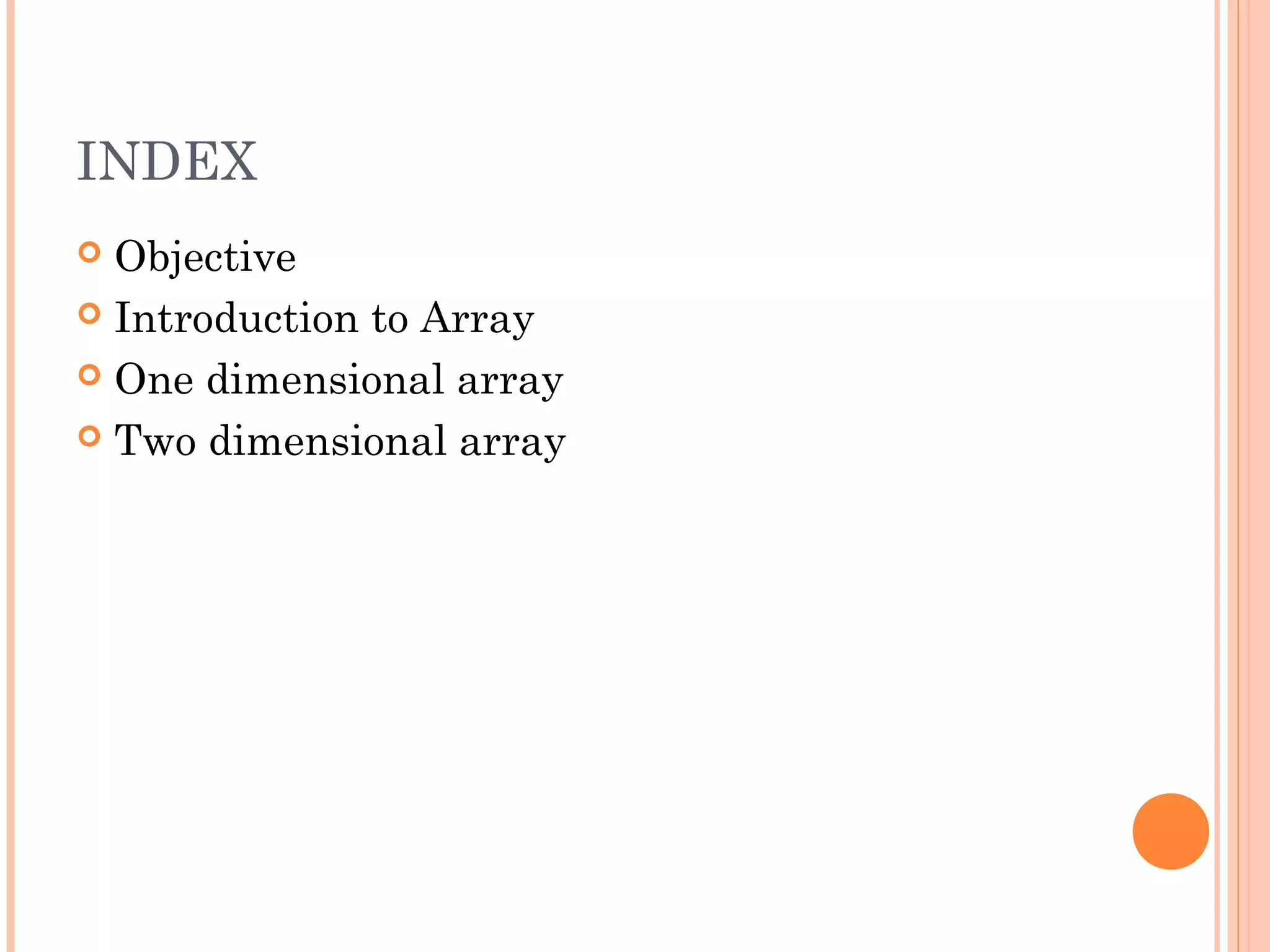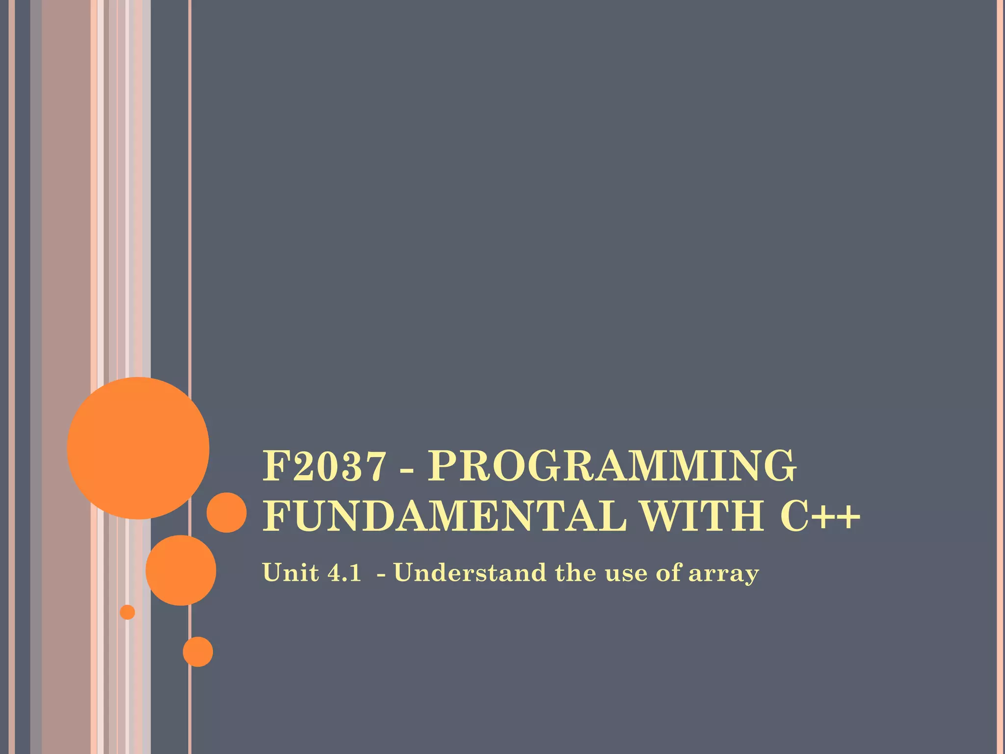 The document discusses arrays in C++. It explains one-dimensional and two-dimensional arrays, how to declare, initialize, and access elements of arrays. Key points include arrays storing a collection of like-typed data, being indexed starting from 0, initializing during declaration, and accessing two-dimensional array elements requiring row and column indices. Examples are provided to demonstrate array concepts.