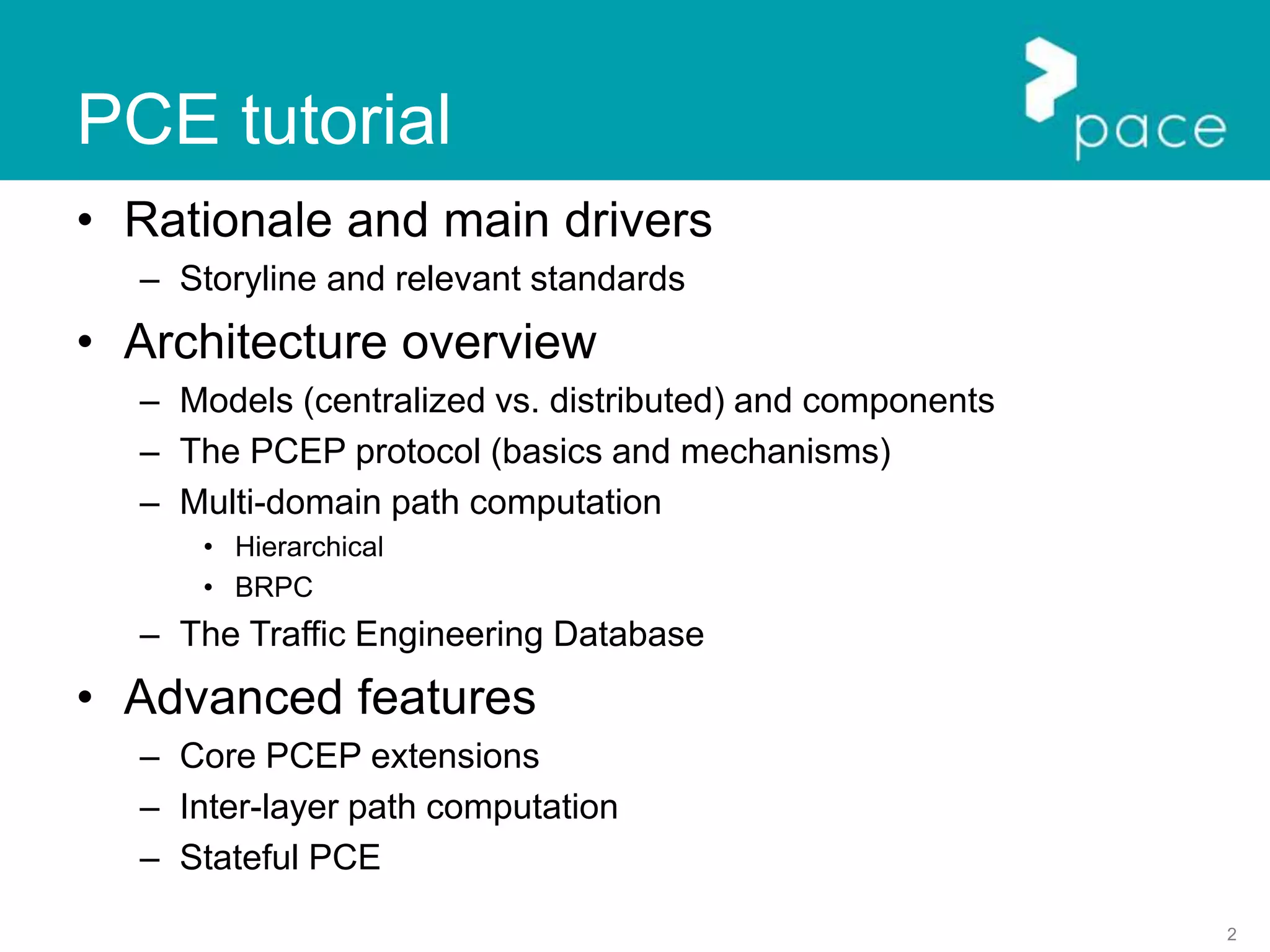 The document provides a comprehensive overview of Path Computation Element (PCE) architectures, discussing its definitions, historical context, and evolution. It outlines the roles of PCE in optimizing path computations for various networking scenarios, including MPLS and optical networks, while emphasizing the need for dedicated computation resources due to increased demand for efficient path routing. The document details the PCEP protocol, which facilitates communication between Path Computation Clients (PCCs) and PCEs, including its structure, message types, and operational steps.