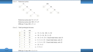 Dokumen tersebut membahas tentang faktor bilangan, kelipatan bilangan, bilangan prima, faktor prima, faktorisasi prima, faktor persekutuan terbesar (FPB), dan kelipatan persekutuan terkecil (KPK). Secara rinci dijelaskan definisi dan contoh perhitungan setiap konsep tersebut.
