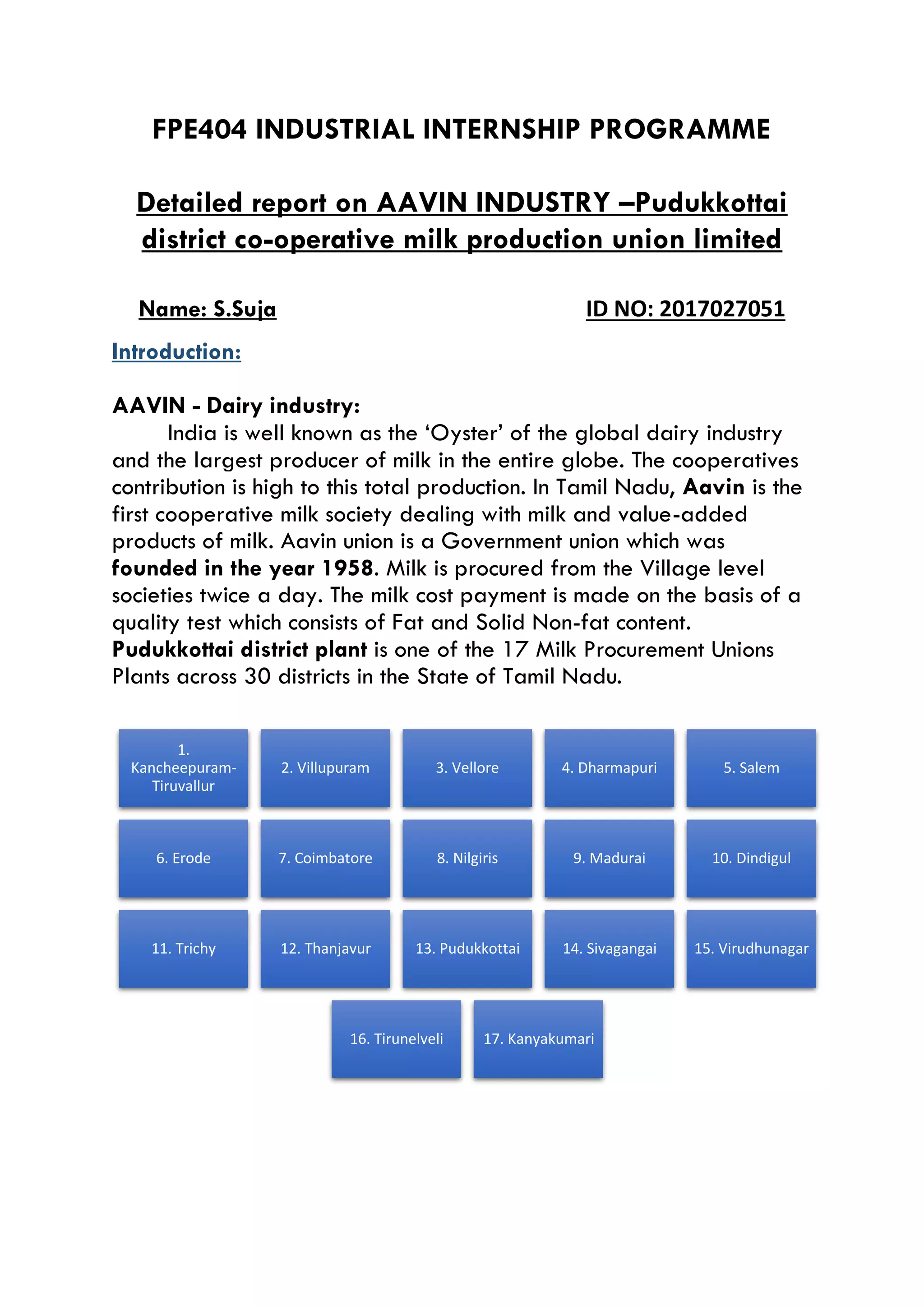 The document provides a detailed report of an industrial internship at Aavin, a cooperative dairy in Tamil Nadu, focusing on its operational aspects, milk processing methods, and quality control measures. Established in 1958, Aavin plays a crucial role in India's dairy industry, particularly in Pudukkottai district, with daily production scales reaching up to 75,000 liters during winter. The internship aimed to enhance understanding of the dairy's functions, from milk procurement to processing and quality testing, highlighting the importance of technological advancements in improving efficiency and productivity.