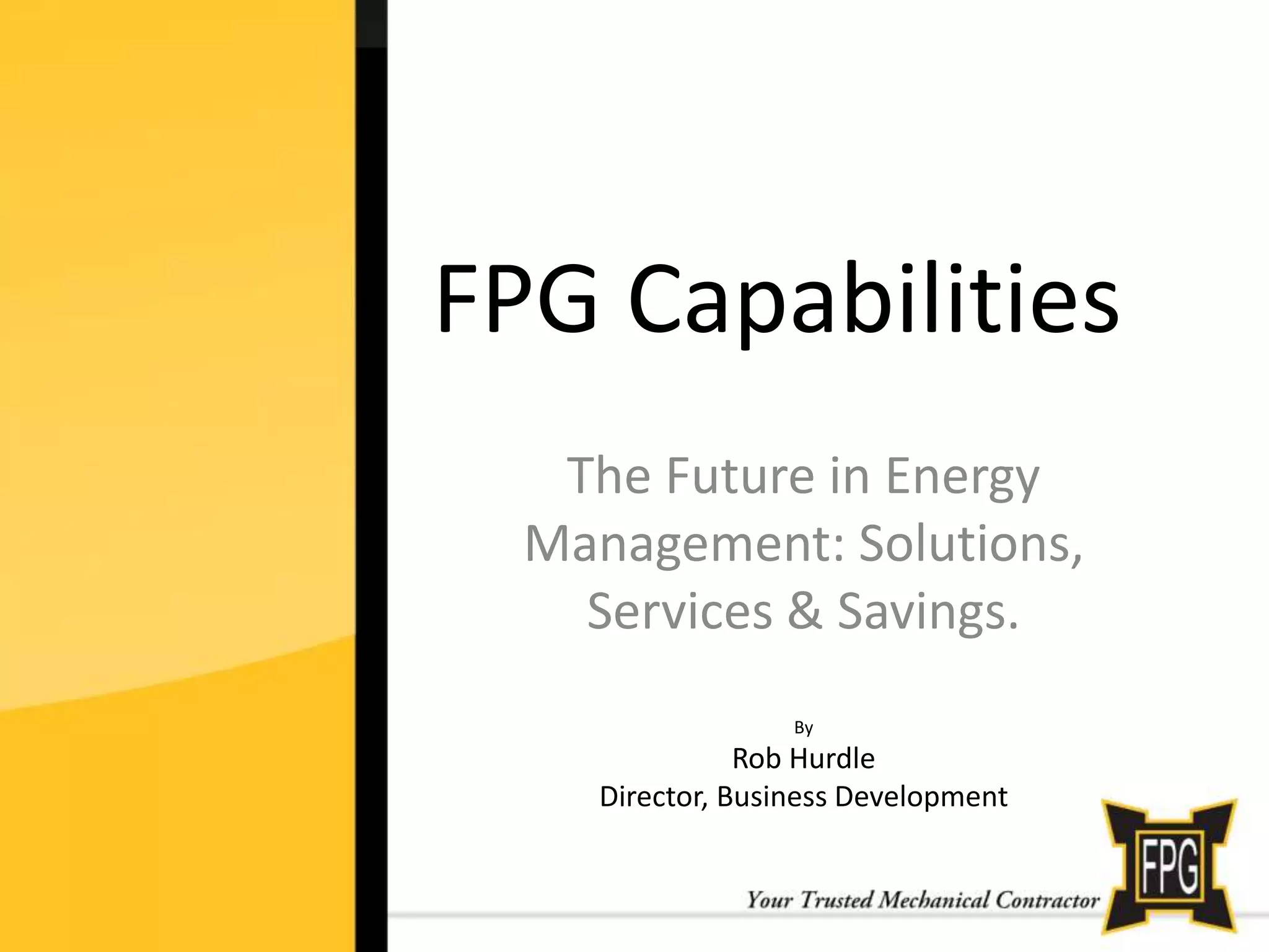 FPG Capabilities provides energy management solutions and services through several mechanical contracting firms. They focus on energy technologies and offer a wide range of services including energy audits, HVAC services, lighting solutions, automation systems, and building envelope improvements. They have experience working with various organizations in healthcare, government, and commercial sectors. Their goal is operational focus and risk reduction through highly skilled and safety-trained staff.