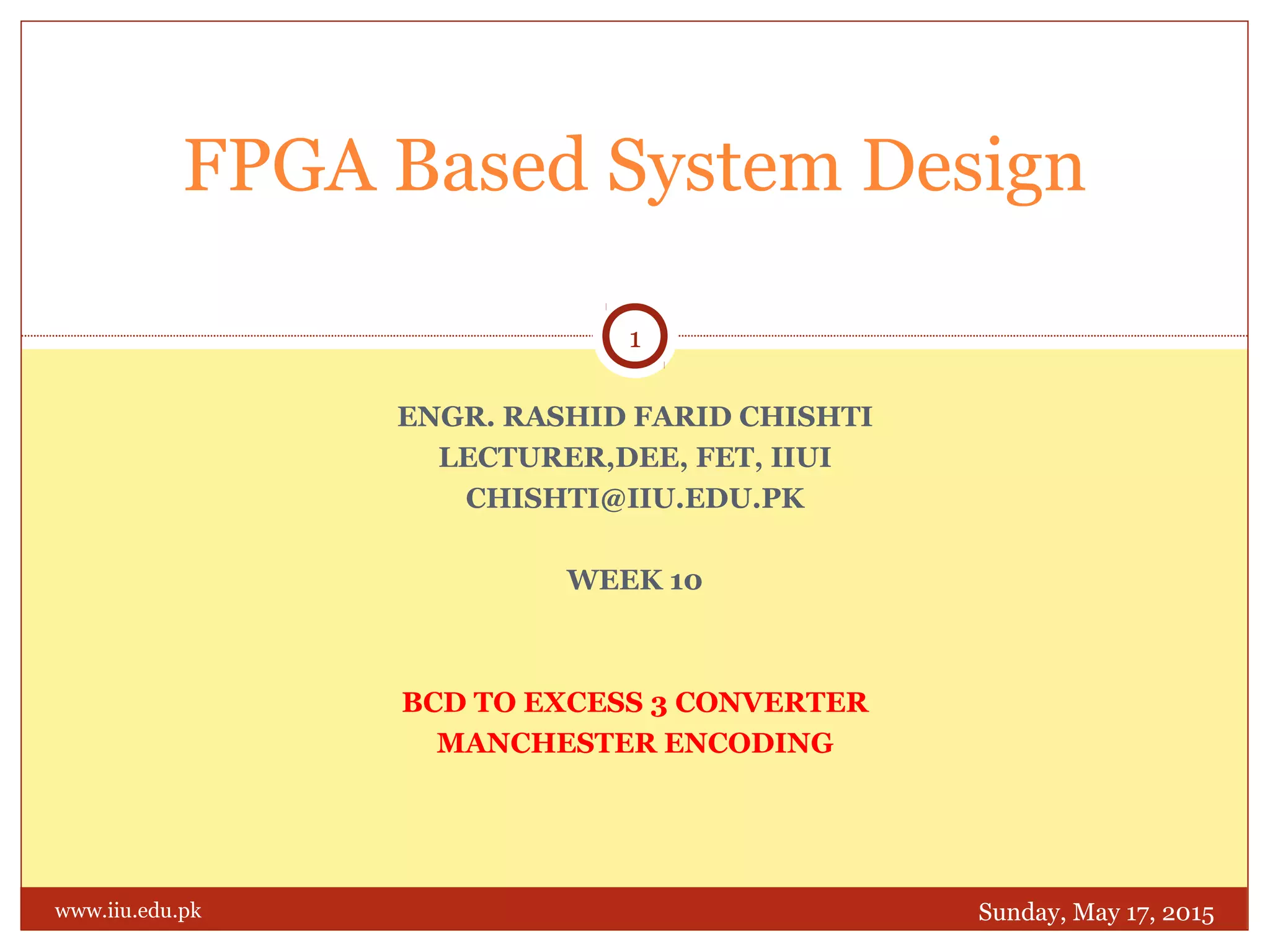 The document discusses BCD to Excess-3 code conversion and Manchester encoding. It describes how to convert a serially transmitted BCD word into an Excess-3 code using a state machine with 3 states. It also explains Manchester encoding as transmitting a 0 as a low-to-high transition and 1 as a high-to-low transition at the midpoint of each period. Verilog code is provided for a BCD to Excess-3 converter and Manchester encoder, along with test benches.