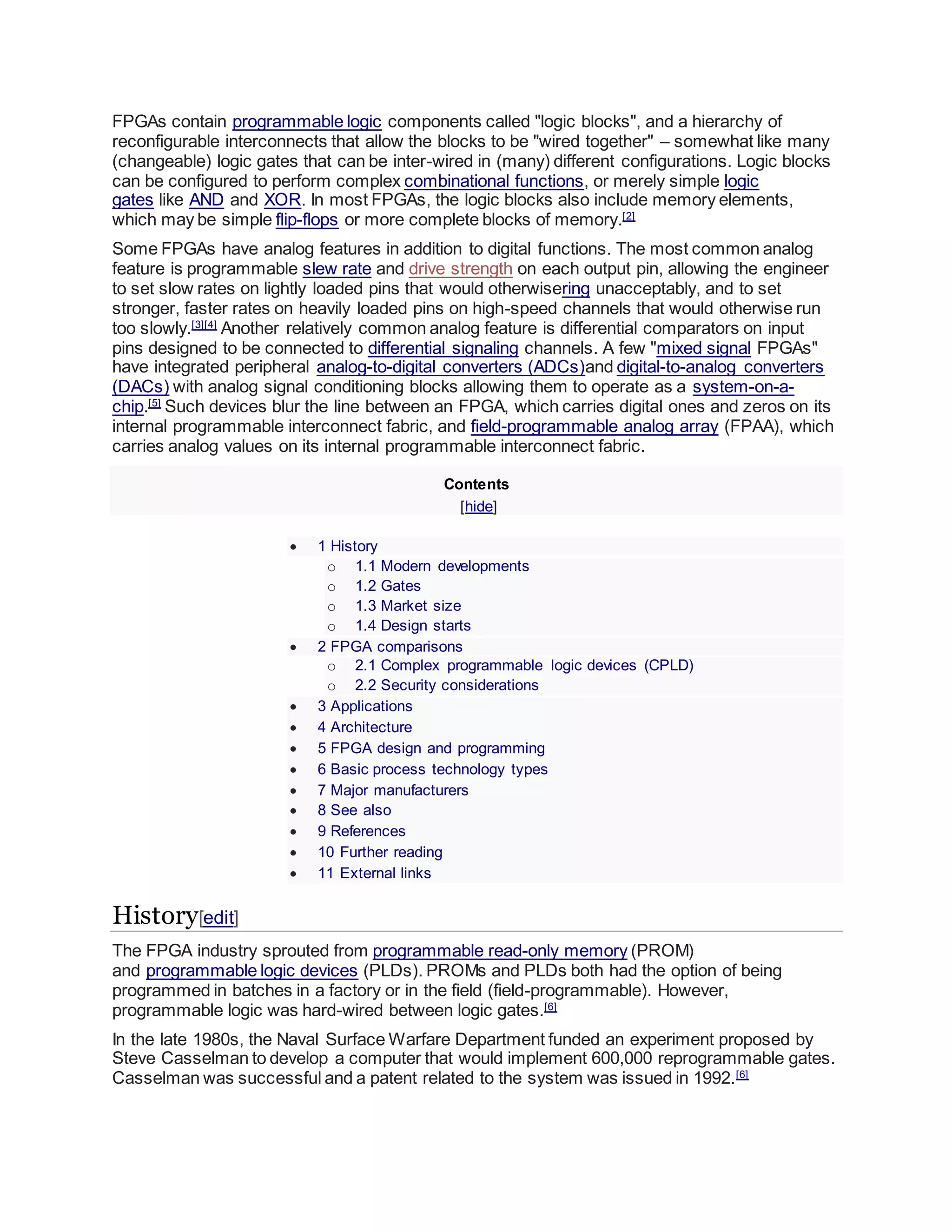 An FPGA (field-programmable gate array) is an integrated circuit designed to be configured by a customer after manufacturing. FPGAs contain programmable logic blocks and a hierarchy of reconfigurable interconnects that allow the blocks to be wired together in different configurations. This flexibility allows FPGAs to implement any logical function that an ASIC could perform, with advantages including the ability to reprogram functionality after shipping and lower engineering costs than an ASIC. Common applications of FPGAs include digital signal processing, software-defined radio, medical imaging, and more.
