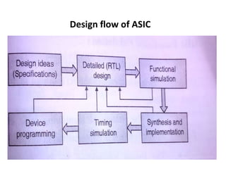 The document discusses different types of programmable logic devices including ASIC, FPGA, and CPLD. It describes the design flow for ASICs and lists common EDA tools for synthesis, simulation, and design entry. Key features of FPGAs are explained such as flexibility, density, cost effectiveness, and avoiding problems of ASICs. The internal structures of CPLDs and FPGAs including lookup tables, I/O blocks, and programmable interconnects are covered. Details are provided on Xilinx Spartan-3 series FPGAs and a comparison is made between FPGAs and CPLDs.
