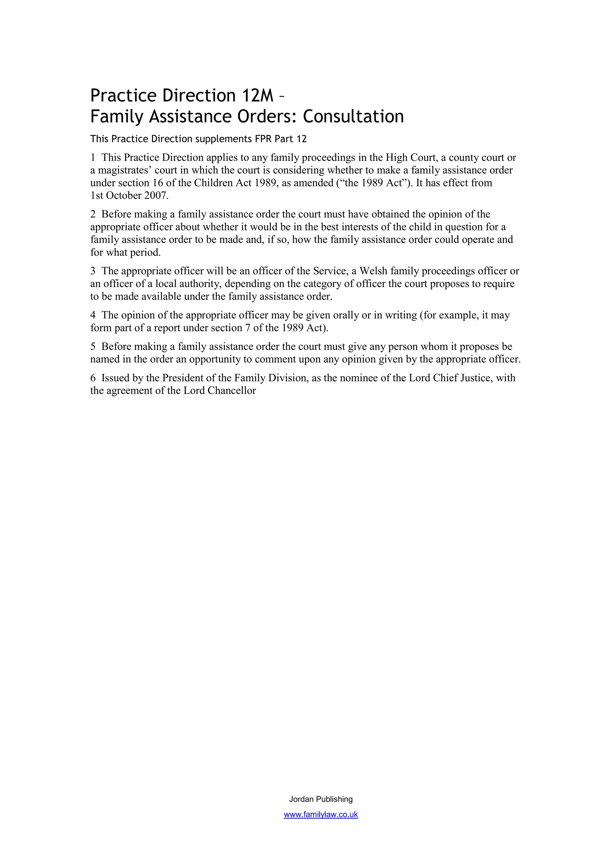 This practice direction provides guidance for courts in England and Wales on obtaining opinions from relevant officers and allowing comments before making family assistance orders under the Children Act 1989. It states that before making a family assistance order, the court must obtain an opinion from the appropriate officer on whether it would be in the child's best interests and how the order could operate. It also requires the court to give anyone proposed to be named in the order an opportunity to comment on the officer's opinion. The direction took effect on October 1, 2007 and was issued jointly by the President of the Family Division and Lord Chancellor.