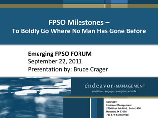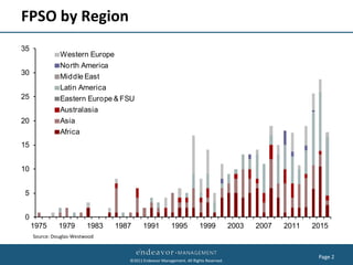 The document summarizes information about FPSOs (floating production, storage and offloading units) including historical and forecasted growth by region, type, and ownership structure. Charts show trends in FPSO usage from 1975 to 2015, with the largest growth being in Asia and the Middle East. Most FPSOs are conversions from existing vessels rather than newbuilds. The largest FPSO owners each operate multiple units, with MODEC, SBM Offshore, and BW Offshore having the most units. In upcoming years, several FPSOs may be available for redeployment after existing contracts expire. The San Jacinto and Seillean FPSOs are highlighted as examples with key technical specifications provided.