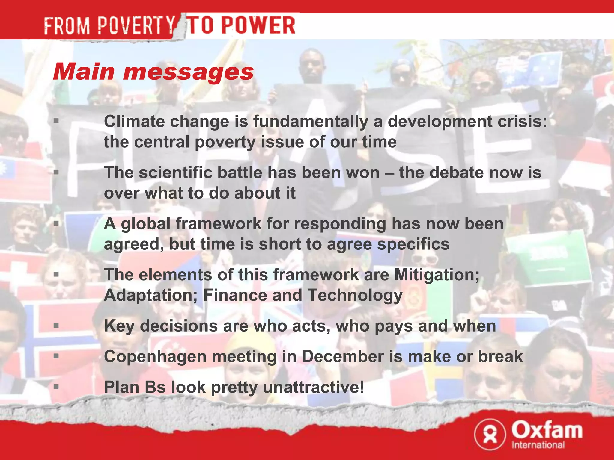 The lecture by Duncan Green highlights climate change as a critical development crisis impacting poverty, food security, and health. It emphasizes the urgency of immediate action to mitigate its effects, particularly in vulnerable regions, with key decisions required at the upcoming Copenhagen meeting regarding who will act, pay, and when. A comprehensive framework for adaptation and mitigation is outlined, demanding substantial financial commitments from developed nations to support developing countries in addressing climate change.