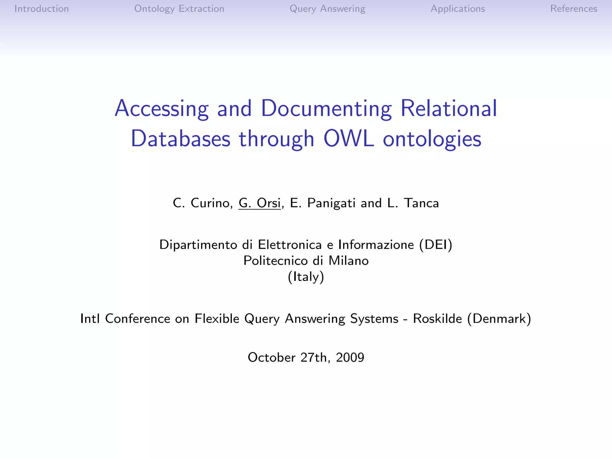 This document describes research on accessing and documenting relational databases through OWL ontologies. It introduces the topic and outlines the key contributions: a general approach for annotating data sources with ontologies, an extension of the Relational.OWL ontology to model relational databases, automatic extraction of ontologies from relational schemas, and applications of the framework. The paper presents an infrastructure for ontology extraction, including a data model ontology (DMO) to represent relational structure, a data source ontology (DSO) extracted from schemas, and a schema design ontology (SDO) that maps the DSO to the DMO. It also discusses query answering by rewriting SPARQL queries to SQL using the generated ontologies