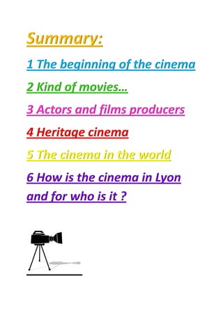 2. There are many genres of films shown in French cinemas, and viewers can choose between standard or 3D/4D experiences. Popular French actors and directors are listed.