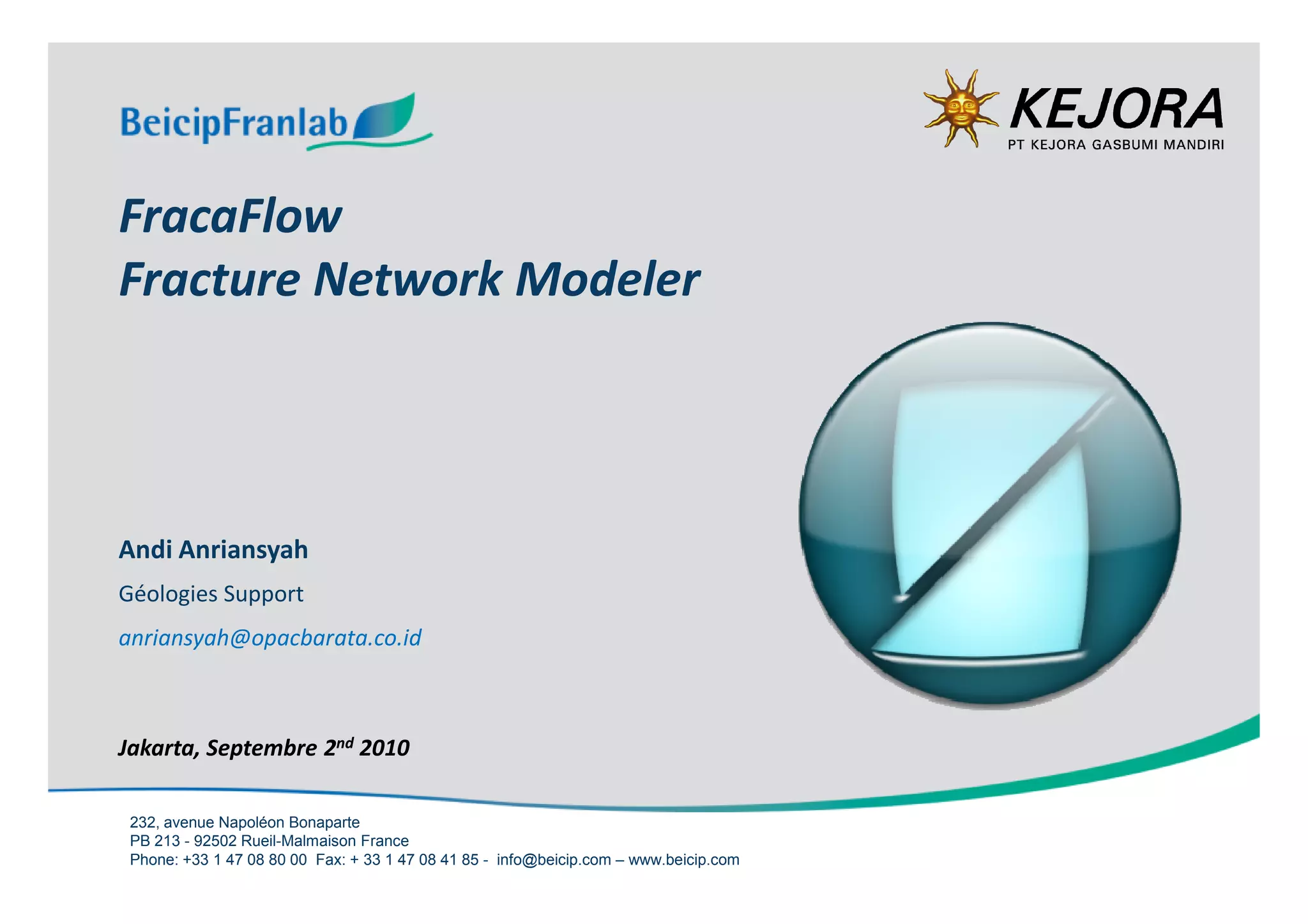 This document outlines the FracaFlow workflow for modeling fractured reservoirs. It involves characterizing fractures from static and dynamic data, building a discrete fracture network model consistent with the conceptual model, calibrating the model using well test and production data, and upscaling the fracture network to reservoir grid blocks for simulation. The goal is to generate a fractured reservoir model with a high level of confidence that accurately captures the geology and fluid behavior.