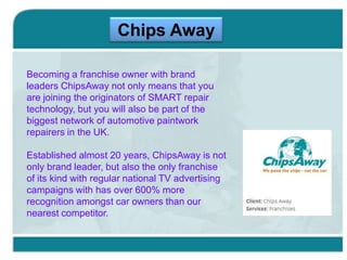 The document outlines various franchise opportunities in the UK, including ChipsAway, a leader in automotive paintwork repair, ComputerXplorers, which offers technology education for children, and Golf Plus Cruise, catering to the growing golf travel market. It also presents C4C, an area car sales franchise that directly offers credit to customers with poor credit histories. Each franchise has distinct features and market advantages, emphasizing growth potential in their respective sectors.