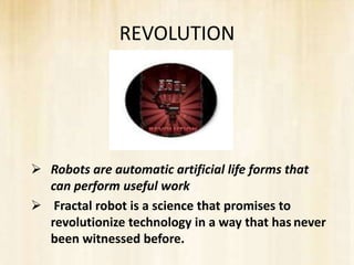 Fractal robots are a revolutionary technology that could transform robotics. They consist of homogeneous electronic cubes that can move and rearrange themselves using basic algorithms. Each cube contains chips and contact pads that allow it to receive signals and power from neighboring cubes. This allows the cubes to move and assemble themselves into various structures. Potential applications include bridge building, search and rescue, medical procedures, defense, and space exploration. However, fractal robots also have limitations as the technology is still in its early stages and control software needs to be more precise.