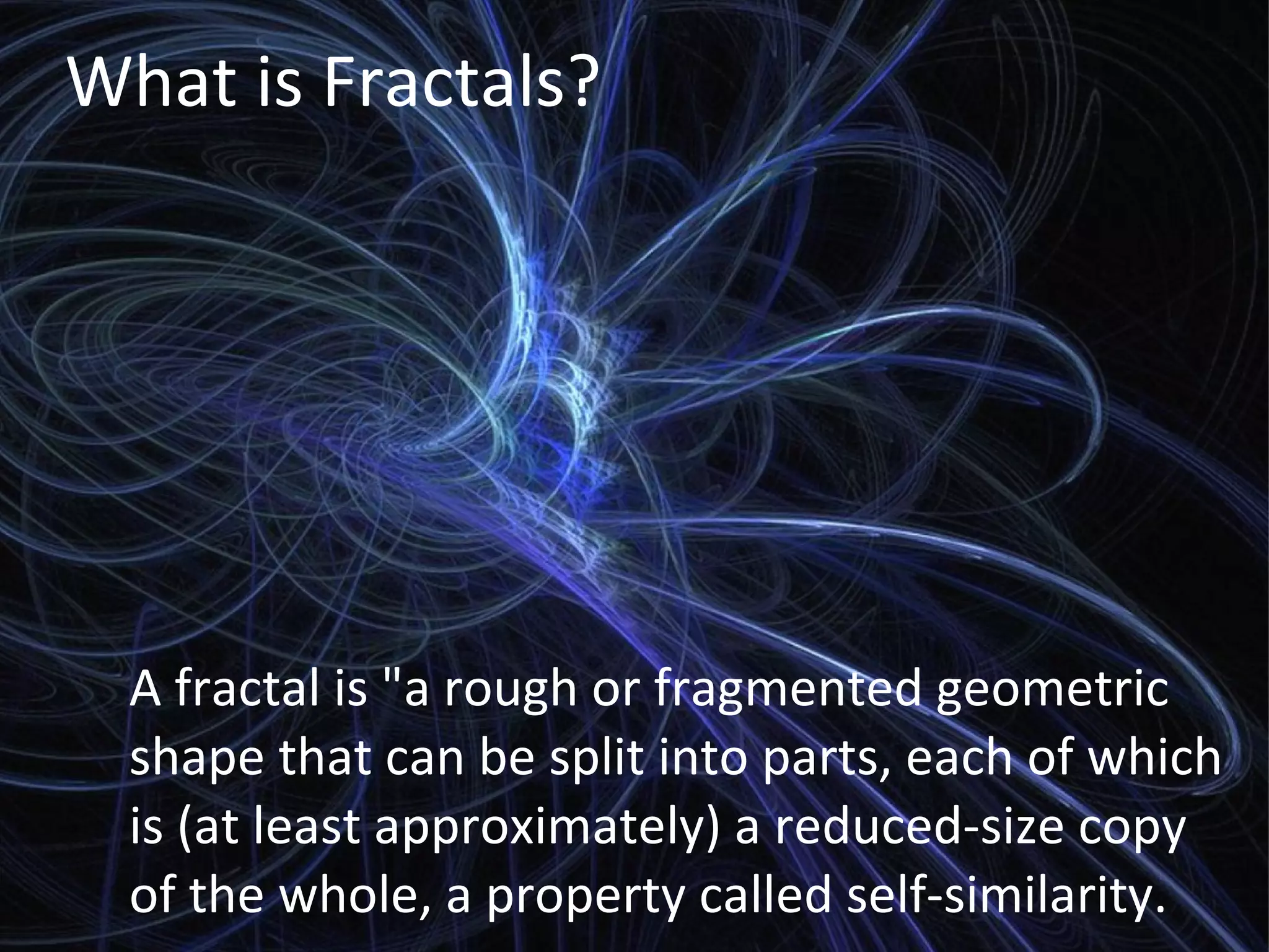 Fractals are complex geometric shapes that exhibit self-similarity, where parts can resemble the whole at different scales. Their mathematical foundations began to develop in the 17th century, culminating in significant definitions in the 19th and early 20th centuries, such as the Koch curve. Fractals are classified based on their self-similarity types, including exact, quasi, and statistical self-similarity, with numerous natural examples like coastlines and snowflakes.