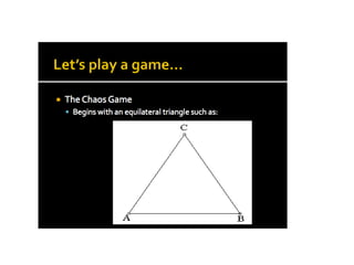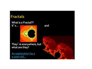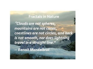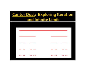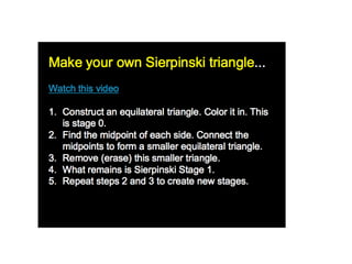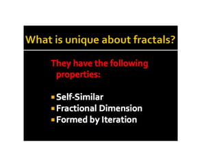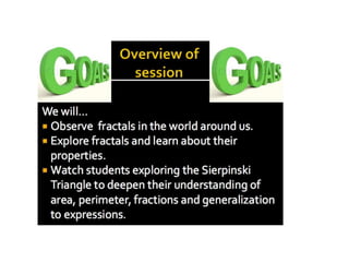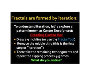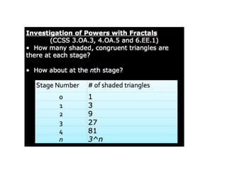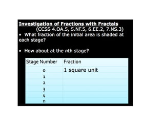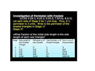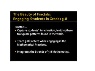 Fractals capture students' imagination, inviting them to explore patterns found in the world around them. Learn how you can use fractals as a springboard to explore number sense, area, perimeter, patterns, and algebra. Use the Illuminations Fractal Tool to explore the properties of self-similarity and have your students make their own fractal.