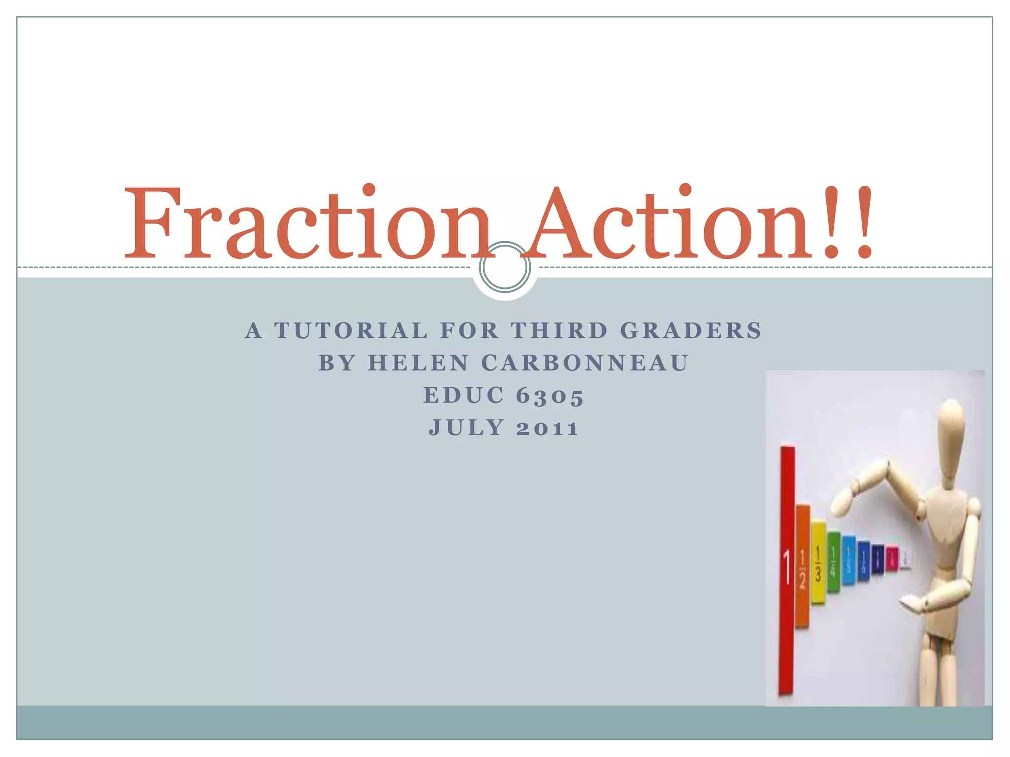 This document provides a 3-part tutorial for teaching fractions to third graders. Part 1 introduces fractions using everyday examples like pizza slices. It explains that a fraction represents a part of a whole and uses visual models like doughnuts cut in halves. Part 2 defines fractional names like halves, thirds, and quarters. It shows how fractions are written and explains numerators and denominators. Part 3 recommends interactive websites for students to practice fractions through games and activities. The overall document aims to build students' understanding of fractions using visual and hands-on examples.