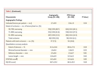 This document discusses fractional flow reserve (FFR), which is a technique used to functionally assess the significance of coronary artery stenosis. FFR is defined as the ratio of maximum blood flow in a stenotic artery to maximum blood flow if there was no stenosis. It is calculated as the ratio of mean distal coronary pressure (Pd) to mean aortic pressure (Pa) during maximal hyperemia induced by pharmacological agents. An FFR value below 0.75 is associated with inducible ischemia, while a value above 0.80 indicates an insignificant stenosis in most cases. FFR has advantages over angiography alone in evaluating stenosis as it accounts for vessel characteristics like length and takes collateral flow into consideration.