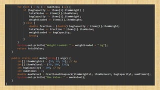 •It calls Double.compare(b.valuePerWeight, a.valuePerWeight), which