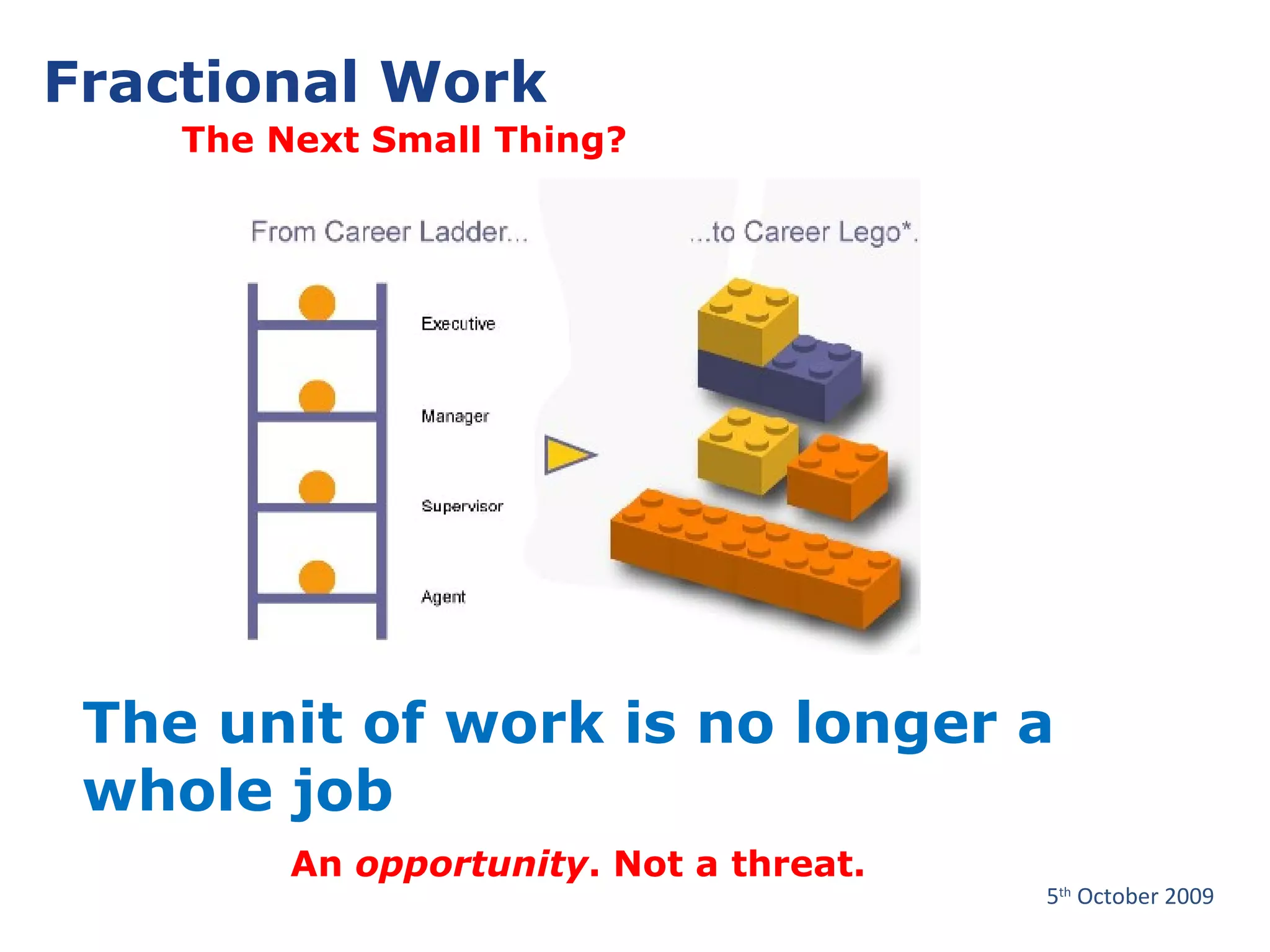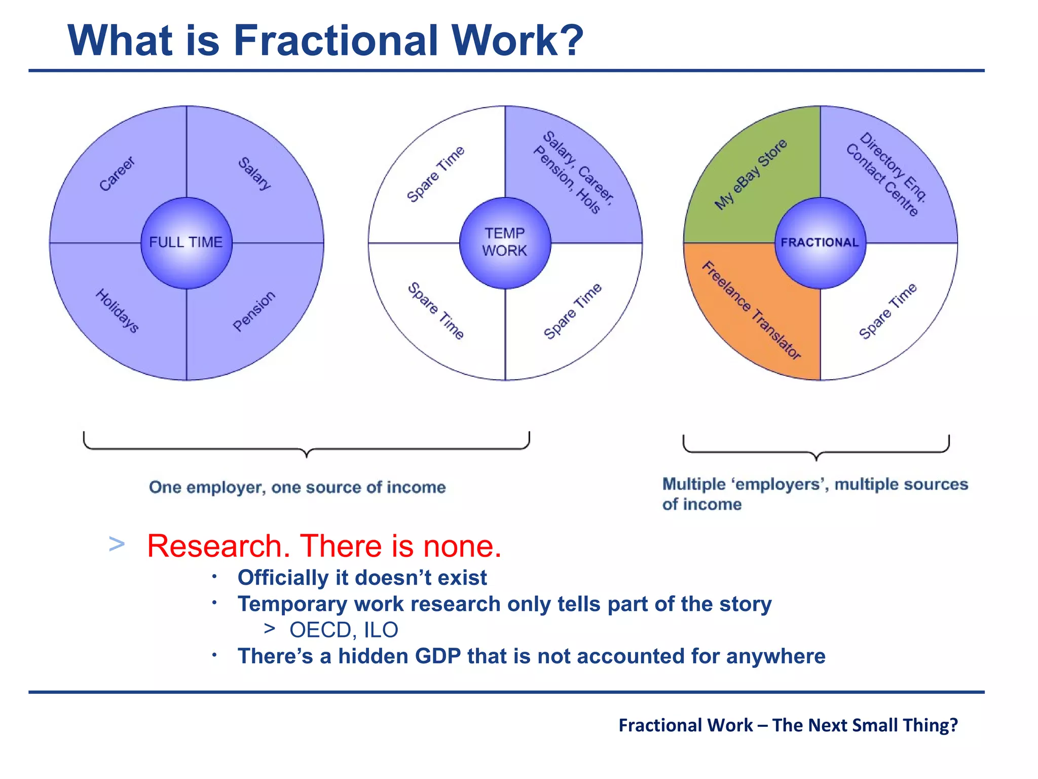 The document discusses the rise of fractional work and its implications for the future of employment, highlighting a significant structural change in the labor market towards on-demand models. It emphasizes the potential for increased employment opportunities derived from multiple smaller roles, while also addressing the challenges posed by government legislation that may hinder the growth of this work model. The conclusion notes the necessity for new policies that support and regulate fractional work to accommodate changing workforce dynamics.