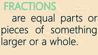 Fractions represent parts of a whole. The document defines fractions such as halves, thirds, and fourths by showing examples of wholes divided into equal parts. It explains that the numerator represents the number of parts being considered and the denominator represents the total number of equal parts the whole was divided into. Different types of fractions are also defined, including proper fractions where the numerator is less than the denominator, improper fractions where the numerator is greater than the denominator, and mixed numbers that combine a whole number and a fraction.