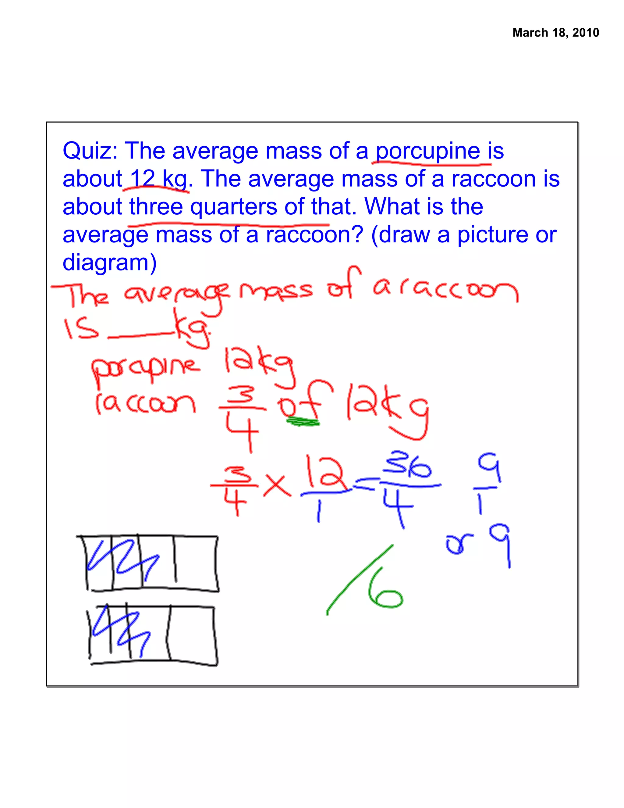 The document contains 5 sections about math concepts: 1) the average mass of a porcupine and raccoon, 2) division, 3) partitive division, 4) quotative division, and 5) dividing fractions by whole numbers. Examples and explanations are provided for each math concept.