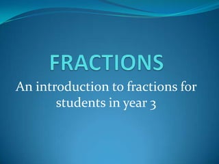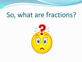 1. Fractions represent parts of a whole that is divided into equal parts. A fraction has a numerator above a denominator, where the numerator tells how many parts are being considered and the denominator tells how many parts make the whole.