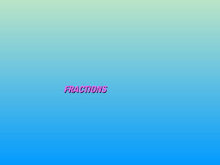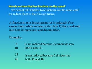 The document discusses fractions including reducing fractions to lowest terms, comparing fractions, adding and subtracting fractions. It provides examples and step-by-step explanations of how to reduce fractions, convert between improper fractions and mixed numbers, find common denominators to add or subtract fractions, and perform the operations of addition and subtraction on fractions. Key points covered include how the numerator and denominator affect the size of a fraction and rules for adding and subtracting fractions including having the same denominator or finding a common denominator.