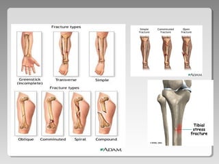 - Types include stress, birth, traumatic, and pathological. Pathological fractures occur in weakened bone.