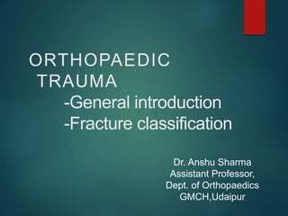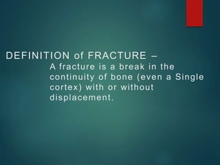 This document provides an overview of orthopaedic trauma and fracture classification. It defines a fracture as a break in bone continuity and classifies fractures based on the fracture line (complete vs incomplete), appearance on radiology, mechanism of injury (direct vs indirect), bone fragment displacement (displaced vs undisplaced), communication with the external environment (closed vs open), and severity of soft tissue damage (Gustillo-Anderson classification for open fractures). The diagnosis involves a history, exam findings like pain, swelling and deformity, and investigations like x-rays, CT scans and MRIs. Management depends on whether the fracture is closed or open, with closed fractures often treated with closed reduction and casting while open fractures require debridement and may
