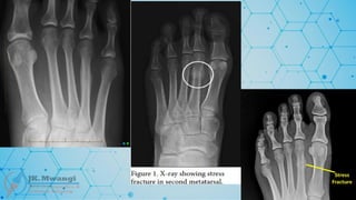 some of the commonest sites of these stress fractures are the metatarsals - where we have the famous MARCH FRACTURES, shaft of tibia and fibula, and the Neck of femur,.