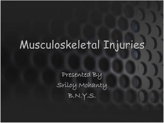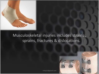 This document summarizes musculoskeletal injuries including strains, sprains, fractures, and dislocations. It defines strains as muscle or tendon injuries from overstretching and sprains as ligament injuries from overstretching. Signs of strains are localized stiffness, discoloration, and bruising, while signs of sprains are pain, swelling, bruising, decreased mobility, and sometimes a popping sound. Treatment for both involves RICE - rest, ice, compression, and elevation. The document also describes different types of fractures like closed versus open, stable versus unstable, and greenstick. First aid for fractures involves immobilization, preventing movement, and transport to the hospital.