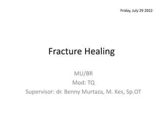 Fracture healing occurs through either primary or secondary bone healing. Primary healing involves direct bone formation without callus and requires perfect stability, while secondary healing involves callus formation over 4 stages - inflammation, soft callus formation, hard callus formation, and remodeling. Several internal and external factors can influence fracture healing, including blood supply, stability, bone stimulators, COX-2 levels, patient diet, diabetes, nicotine use, medications, and health conditions.