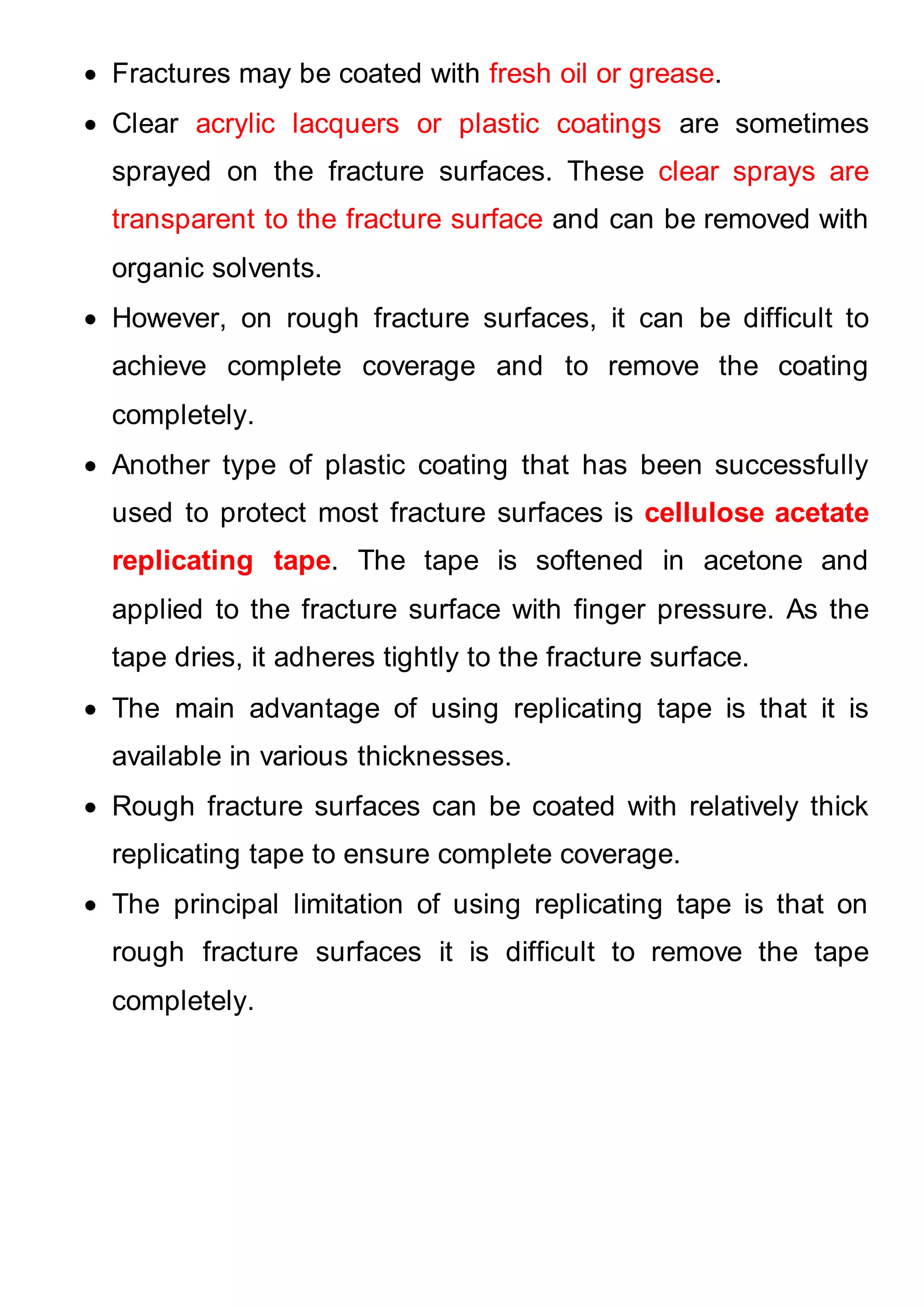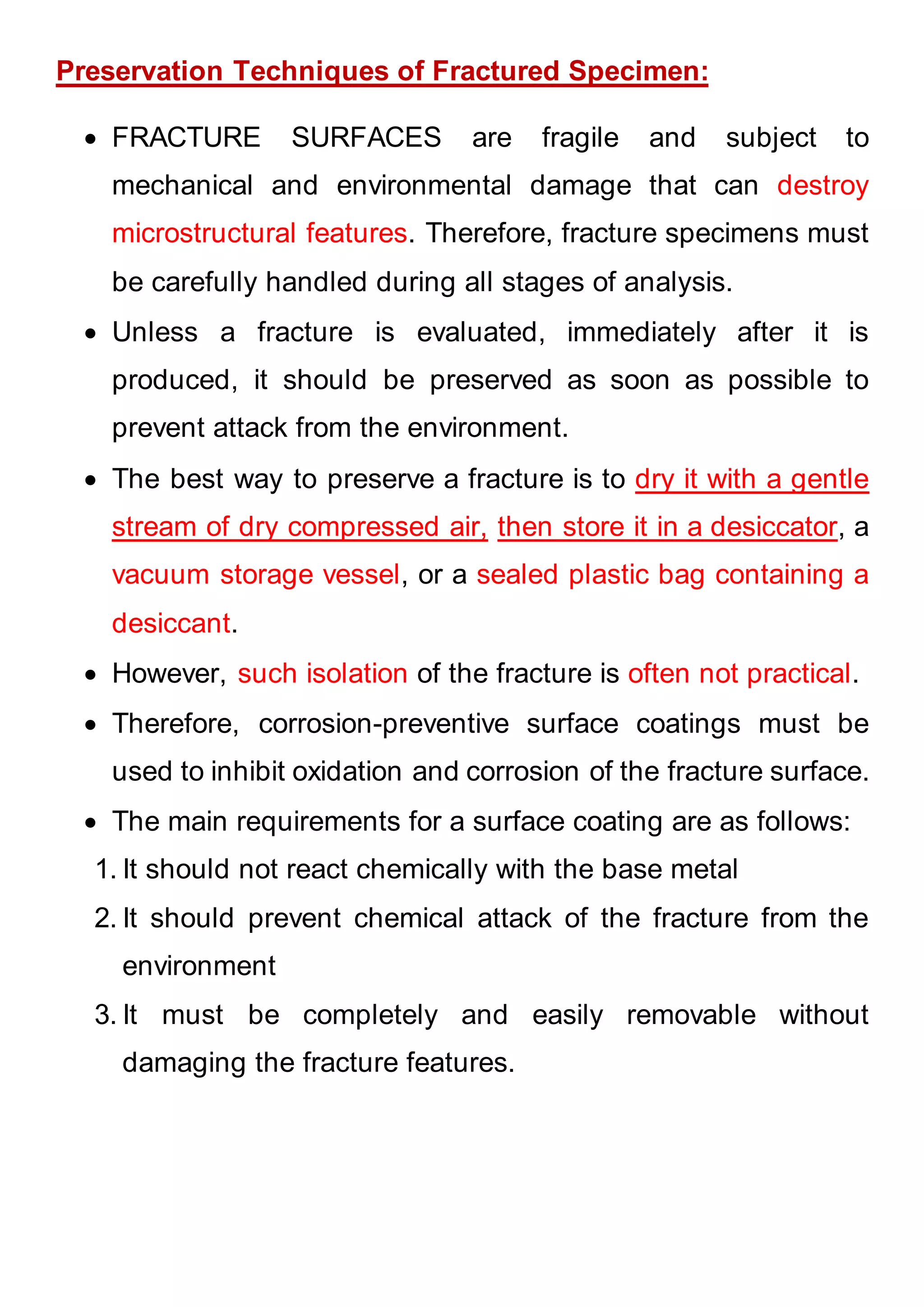 Fractured specimens must be carefully preserved and handled to prevent damage. The fracture surface should be coated immediately using dry air, desiccants, or transparent coatings like oil, grease or acrylic lacquers. These coatings protect the surface from environmental damage but must be completely removable without harming microstructural features. Various cleaning techniques can then be used to remove deposits from the fracture surface, such as using solvents, detergents, cathodic electrolysis or chemical etching, with the goal of revealing important microscopic details without introducing new damage.