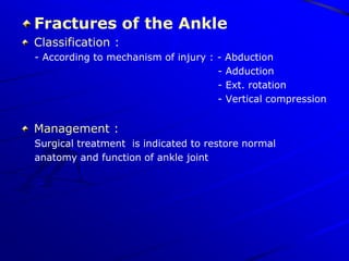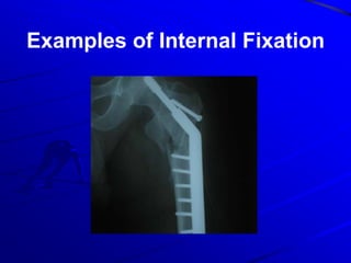 Fractures of the lower limb can result from high-energy trauma or osteoporosis in the elderly. Common fractures include the femur, patella, tibia, fibula, ankle, and bones of the foot. Treatment depends on the type and location of the fracture, ranging from closed reduction and casting to open reduction with internal fixation using plates, screws, or intramedullary nails. Pelvic fractures may also require surgical fixation depending on the forces involved and stability of the injury.
