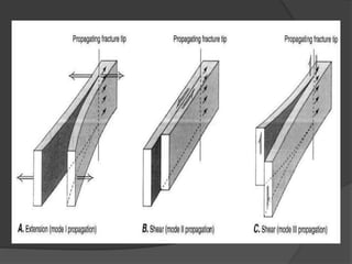 Fractures are weaknesses in rock where separation can occur. They form due to stress from tectonic and other geological forces. There are two main types of fractures: faults where adjacent blocks are displaced parallel to the fracture surface from shearing; and joints where blocks move perpendicular with no displacement. Fractures are important for fluid migration, understanding geology and tectonics, and engineering projects. They are classified based on displacement and can be identified through field evidence like offset strata, slickensides and fault rocks.