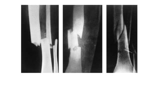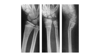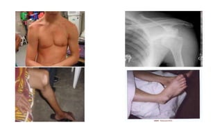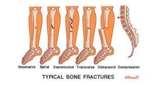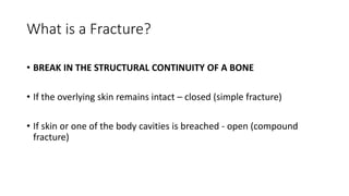 A fracture is a break in the bone caused by direct or indirect force. There are different types of fractures including complete, incomplete, transverse, oblique, and comminuted. Fractures can be displaced by forces of injury, gravity, muscles, or patient age. Symptoms include pain, swelling, deformity, and loss of movement. Treatment depends on the fracture and may include splinting, casting, traction, or surgery. A dislocation occurs when bones at a joint are no longer in proper contact, most commonly in the shoulder, elbow, thumb, or knee. Signs include deformity, pain, swelling, and loss of function. Treatment focuses on RICE (rest, ice, compression, elevation
