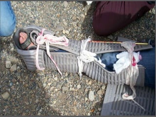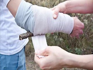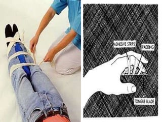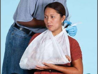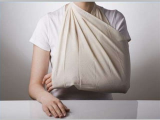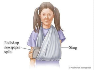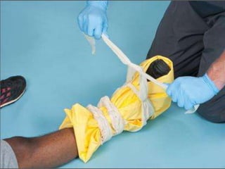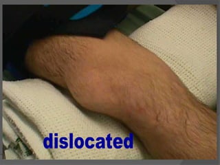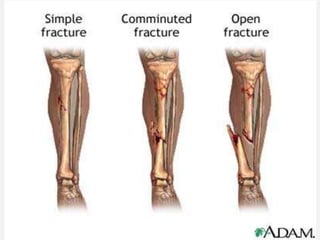 This document discusses signs of serious muscle, bone, or joint injuries and provides information about fractures, dislocations, sprains, and strains. It notes that significant deformity, bruising, swelling, inability to use the affected area normally, bone fragments sticking out of wounds, feeling bone grating after injury, hearing a pop or snap at time of injury, or the area being cold or numb could indicate a serious injury. It provides details on closed and open fractures, as well as treatment guidelines for soft tissue injuries using RICE (Rest, Ice, Compression, Elevation).
