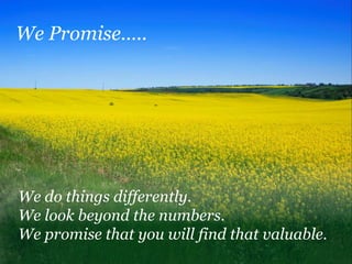 We promise to take a different approach by looking beyond numbers. Our clients will find this valuable. The document outlines a three step prosperous journey of knowing yourself, visualizing goals, and building a proper portfolio through determining allocations, selecting investments, implementing and monitoring progress with dedicated investment management. It contrasts what successful and unsuccessful investors do and provides options to view an animated presentation.