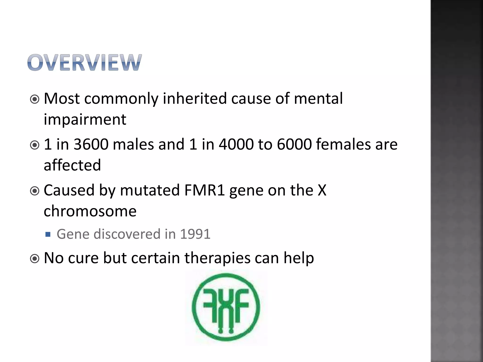 This document summarizes Fragile X syndrome. It is caused by a mutation on the FMR1 gene on the X chromosome, which normally produces a protein involved in brain development and function. Fragile X syndrome is characterized by intellectual disabilities and certain physical traits. While there is no cure, treatment aims to manage symptoms through educational and therapeutic interventions, as well as medication in some cases.