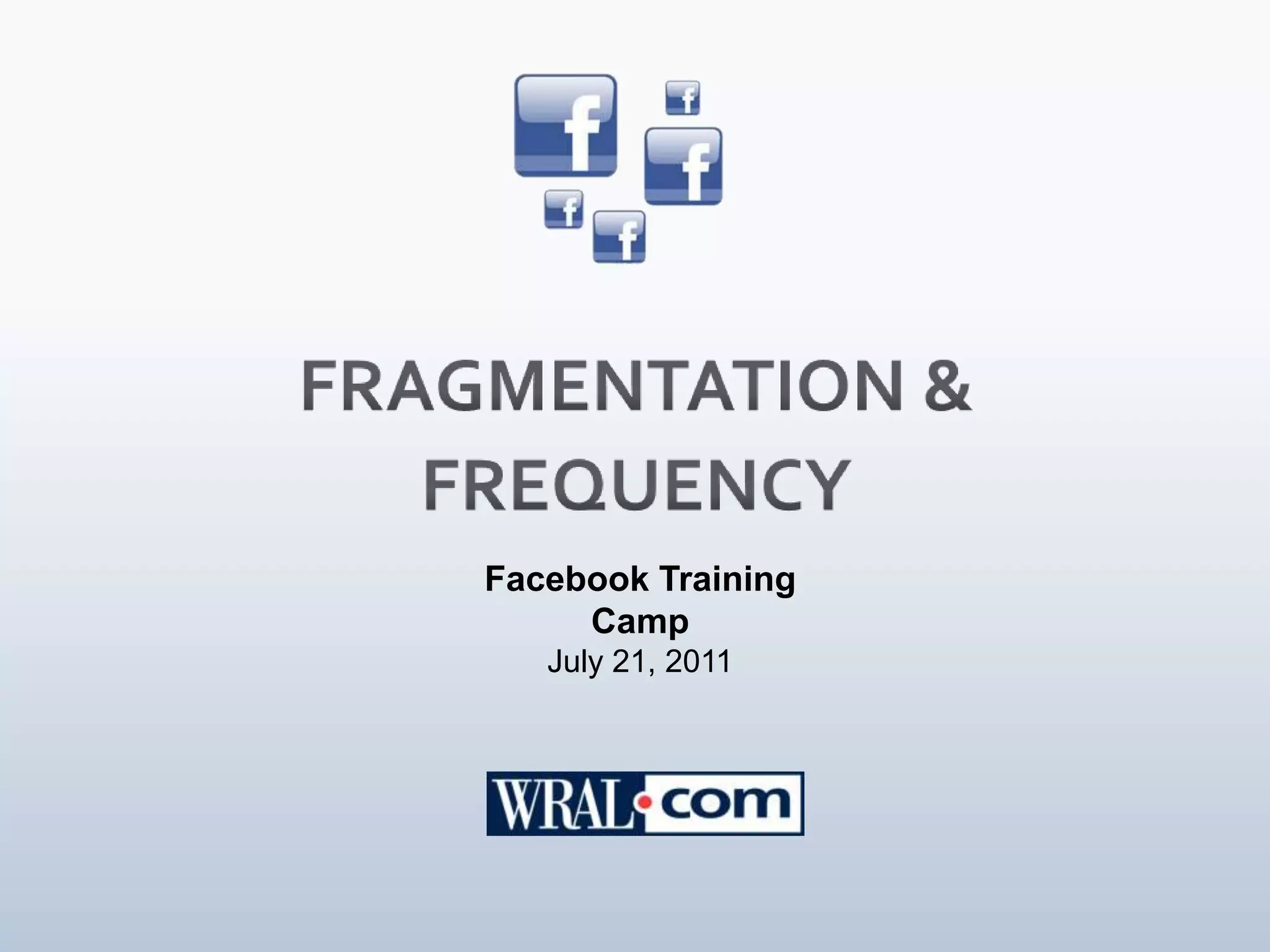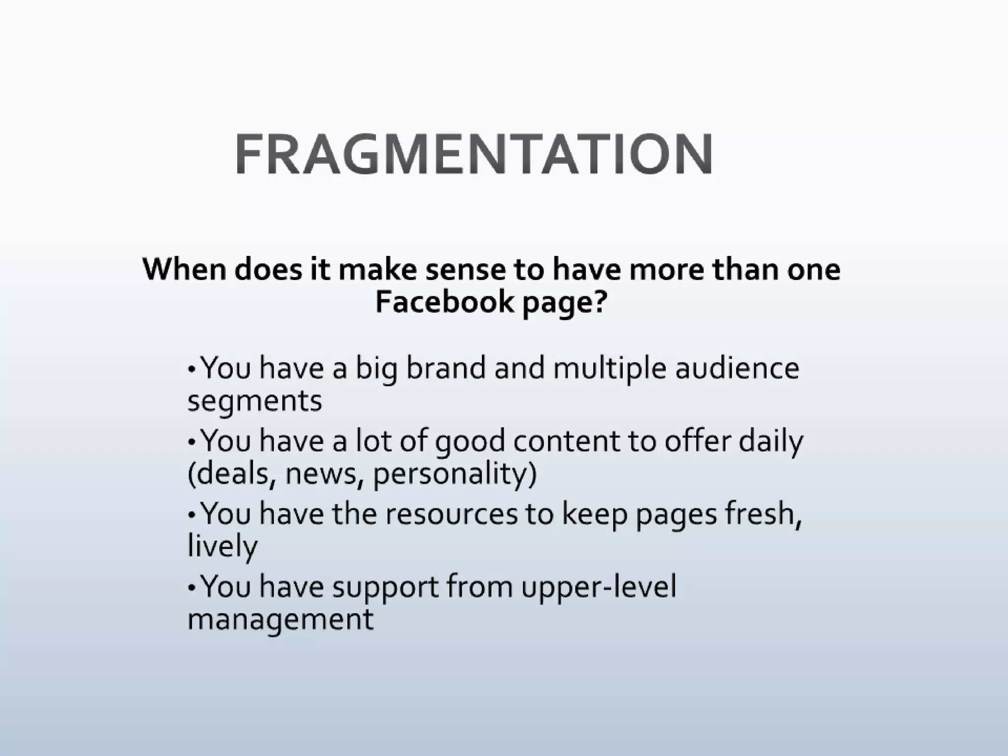 This document discusses strategies for managing multiple Facebook pages for a brand. It recommends having additional pages when a brand has different audience segments, significant daily content, and resources to maintain fresh pages. It provides examples of large brands like Dell and Cisco that operate multiple specialized pages. The document also discusses optimal posting frequencies, noting engagement drops off significantly if a page posts more than every 80 minutes. It advises pages post at least daily while considering peak usage times, but also using off-peak times as an opportunity. The key is for pages to observe user behavior and adjust their posting strategy accordingly.